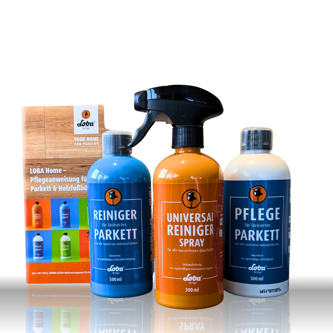 Unser Reinigungs- und Pflegeset lackiert / universal ist die perfekte Lösung für alle, die ihre lackierten Holzböden schonend reinigen, pflegen und langfristig erhalten möchten. Es wurde speziell für versiegelte Oberflächen entwickelt – reinigt effektiv, pflegt die Lackschicht und schützt die Oberfläche nachhaltig vor Abnutzung.