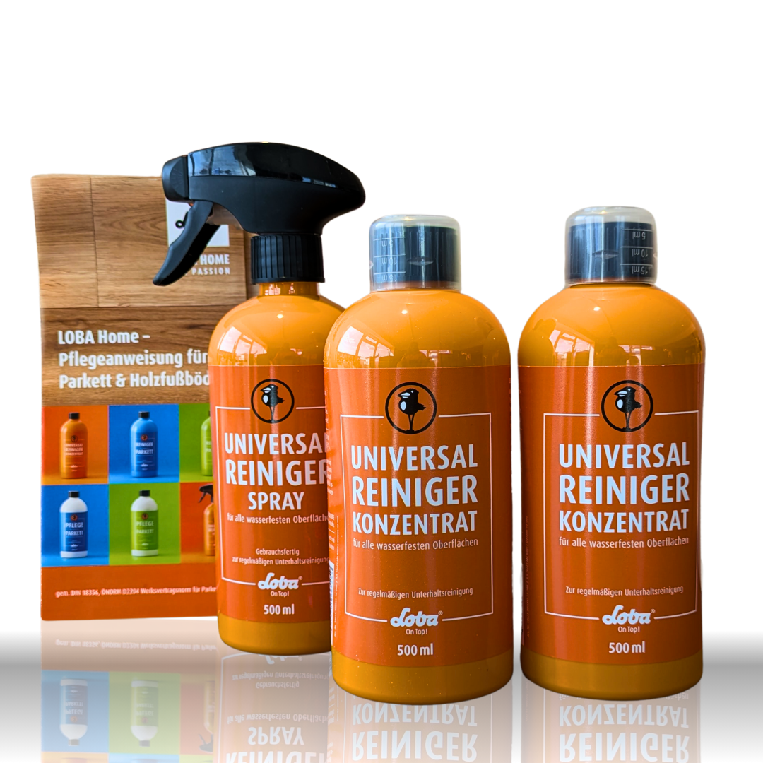Mit der richtigen Pflege bleiben selbst beanspruchte Oberflächen länger schön und hygienisch sauber – das Loba Universalset macht’s einfach und effektiv.